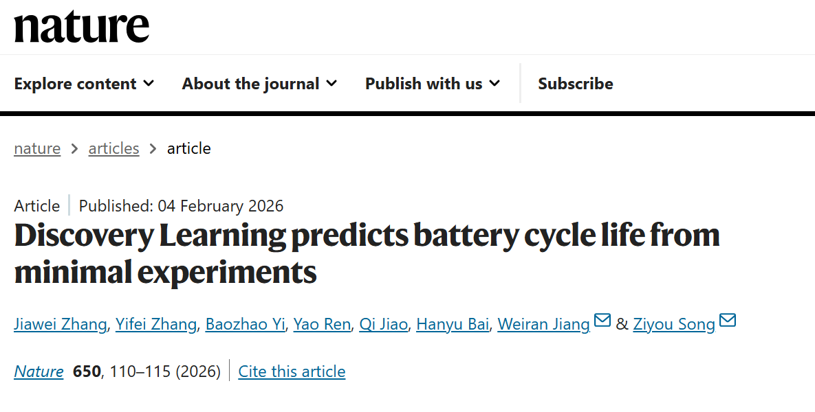 2月4日,孚能科技研发副总裁姜蔚然与密歇根大学安娜堡分校教授宋子由合作领衔,在国际顶级学术期刊《Nature》发表题为“Discovery Learning predicts battery cycle life from minimal experiments”的研究论文。通过深度利用机器学习与AI突破,为全球动力电池行业的技术进步注入新活力。